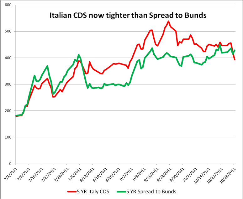 I’m going to assume that the new “wrapped” bonds would price at 25% of France (as middle of the road of the AAA wrappers) and 75% of straight Italian debt. I’m going to assume that part of today’s weakness is that the market is already treating these new bonds as structurally inferior to the wrapped bonds, so I won’t assume a further sell-off. That would give me a yield of 4.04% (75% of 4.93% and 25% of 1.38%). I suspect the yield would be a bit higher as French yields likely to go out further once the EFSF starts issuing guarantees, and Italian secondary markets may be weaker still once the new, preferential paper is issued. The ECB may cut rates by then too, just so that the yields would be lower. Over 4% for 3 year money isn’t bad, but it doesn’t seem like a game changer. Especially since Italian banks will have to fund being benchmarked to the subordinated Italian yields and that “insured bond” yield will be isolated to that particular bond and won’t flow through the system.